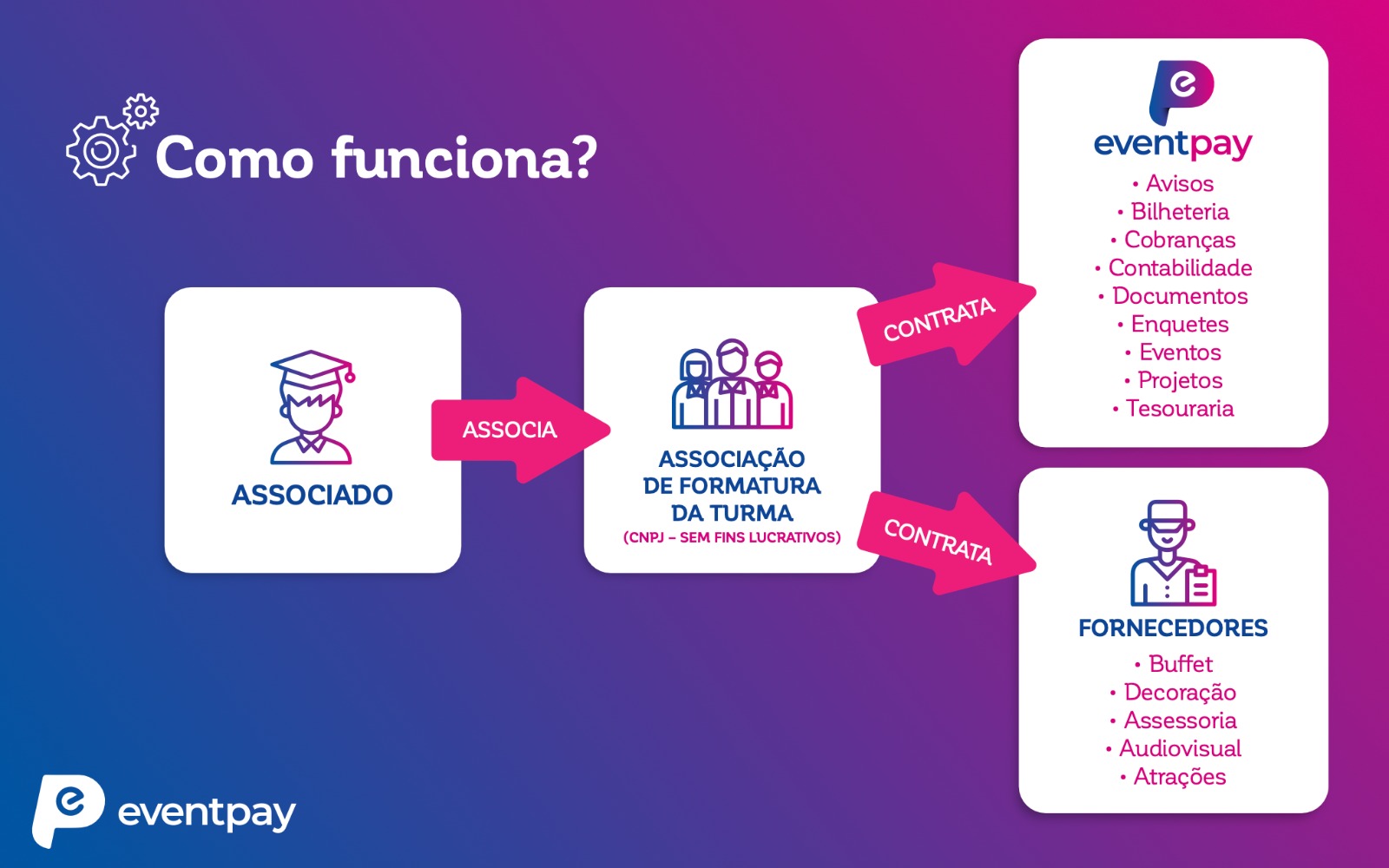 Essa associação, então, contrata tanto a Eventpay quanto os fornecedores responsáveis para os seus eventos. Cada parte cumpre um papel essencial.
